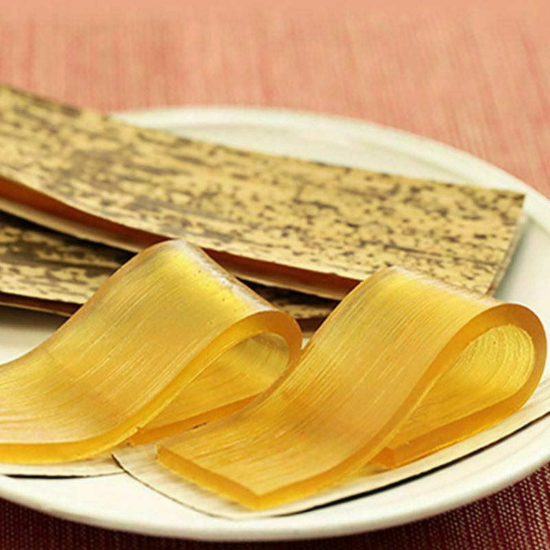 梅を寒天に練り込み、薄く伸ばして乾燥させ、竹皮で挟みました。ほどよい甘酸っぱさと上品な味わいの山形名菓です。