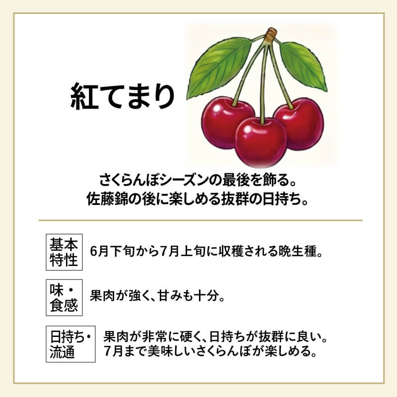 数あるさくらんぼの中でも強烈なインパクトを誇る紅てまりは、いつもとひと味違う贈り物をお探しの方におすすめです。