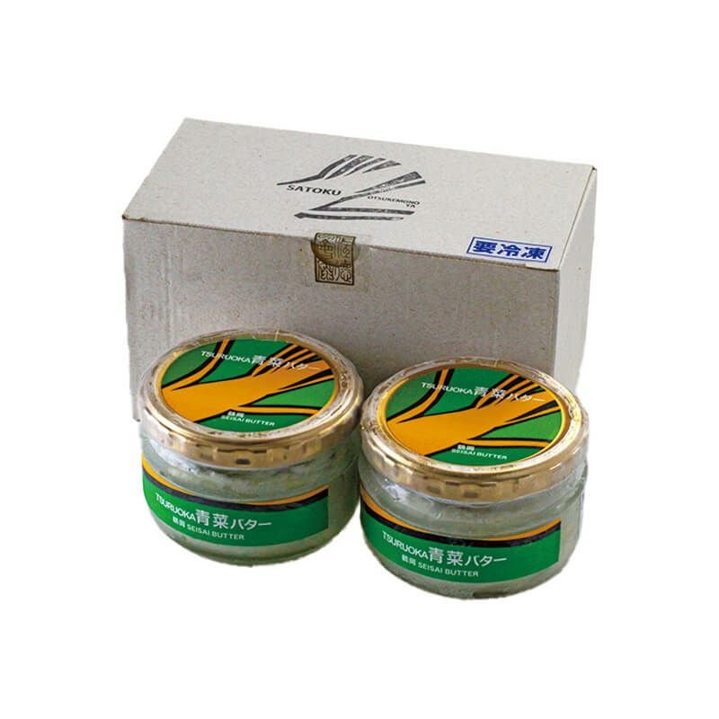 在来野菜・青菜(せいさい)を醤油漬けにした、山形県を代表する漬物「青菜漬」と北海道よつ葉バターを組み合わせて作った斬新なスプレッドが「TSURUOKA青菜バター」。「Barでフレンチシェフと遭遇したのがきっかけで出来ちゃいました(笑)」と誕生秘話を語る7代目社長の佐藤さん。