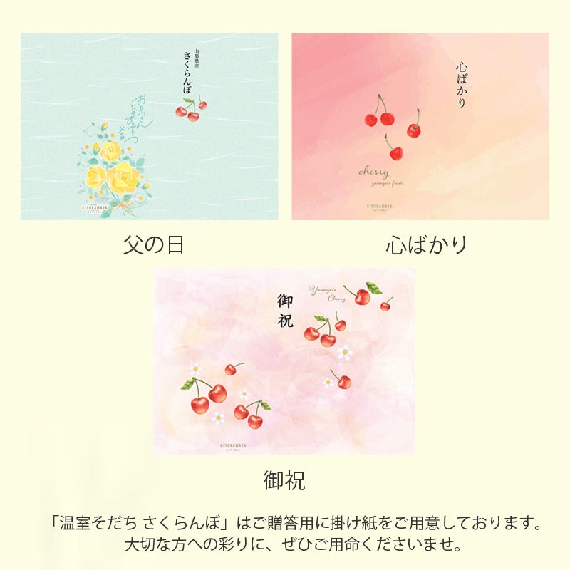 「温室そだちさくらんぼ」は、ご贈答用に各種掛け紙をご用意しております。少し早い父の日の贈り物やお祝い、手土産にぴったりの装いで、山形の味覚をお届けできます。