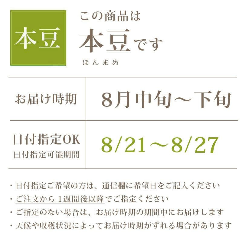 「本豆」の収穫時期は8月中旬~下旬頃。一番の最盛期に収穫される“さかり”の豆で、シーズンを通して最も人気のあるだだちゃ豆です。