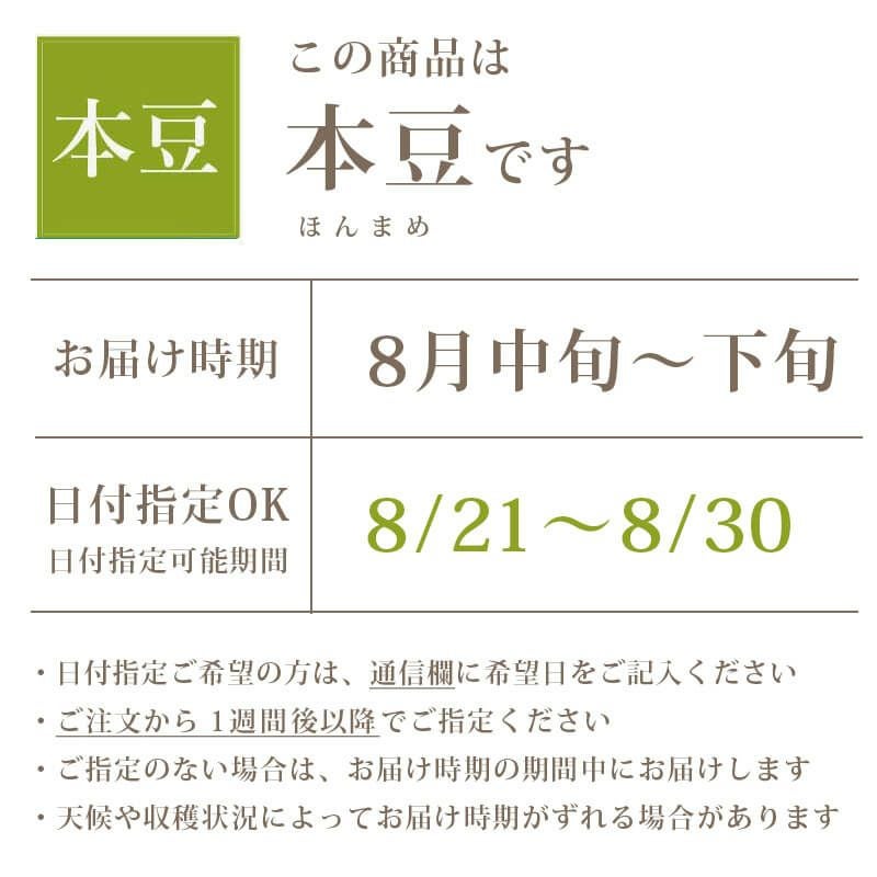 「本豆」の収穫時期は8月中旬~下旬頃。一番の最盛期に収穫される“さかり”の豆で、シーズンを通して最も人気のあるだだちゃ豆です。 甘み・コク・旨みを堪能したい方、初めてだだちゃ豆を召し上がる方におすすめ。一度は食べていただきたい逸品です。