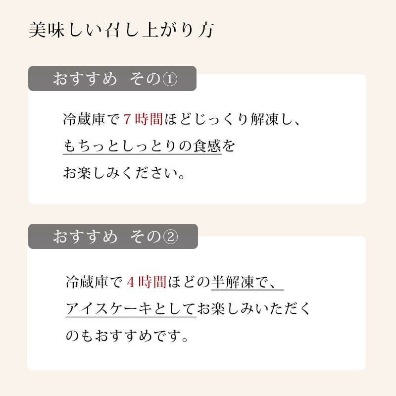 繊細な風味を楽しむため、必ず冷蔵庫で7時間ほどじっくり解凍してください。解凍後はお早めにお召し上がりください。