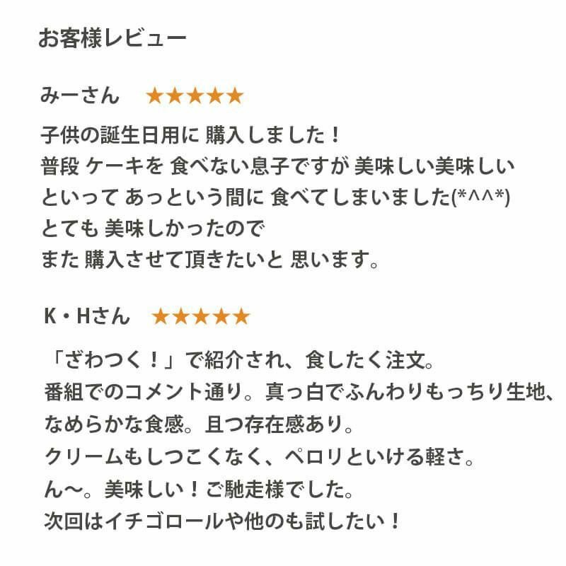 初めて買わせていただきました。 2個買って1個は知り合いにプレゼントしたのですが とても美味しかったと凄く喜んでもらえました もう1個は孫と一緒に食べました とても美味しかったです 孫はイチゴのロールケーキがとても気に入ったみたいです また買わせて頂きます。 今度はパンも一緒に買います。
