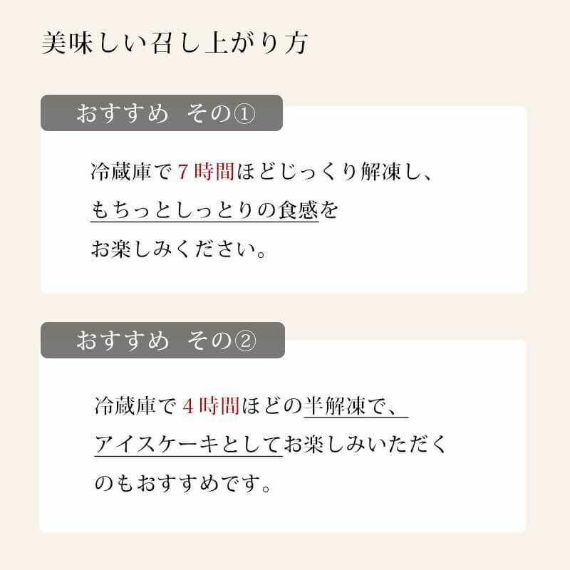 冷蔵庫で7時間ほどじっくり解凍していただくと、スポンジのもちっとした食感と、ミルキーなコクと甘酸っぱいいちごのハーモニーの生クリームを美味しくお召し上がりいただけます。