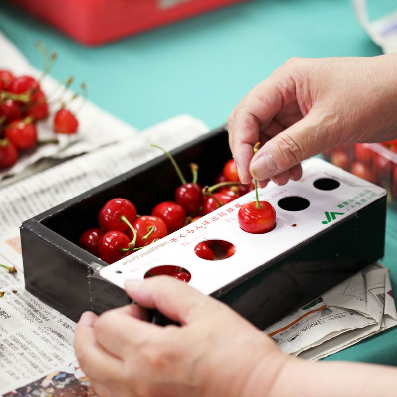 収穫されたさくらんぼは、大きさを揃え、色あいを揃え、一粒ずつ、職人の手と目で丁寧に詰めていきます。実を触りすぎず、隙間や凹凸が出ないようにするには熟練の技術が必要。さくらんぼの軸が見えないよう、天地を返して詰めていき、最後は並べ方に乱れがないか、お箸を使って微調整をして完成。