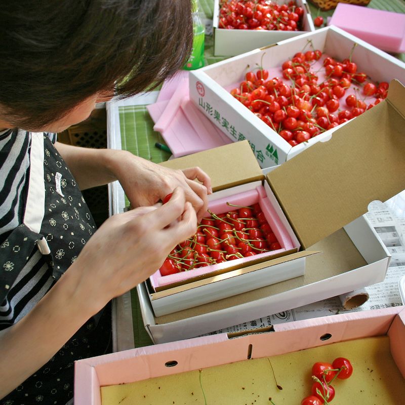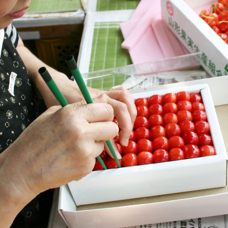 収穫されたさくらんぼは、大きさを揃え、色あいを揃え、一粒ずつ、職人の手と目で丁寧に詰めていきます。実を触りすぎず、隙間や凹凸が出ないようにするには熟練の技術が必要。さくらんぼの軸が見えないよう、天地を返して詰めていき、最後は並べ方に乱れがないか、お箸を使って微調整をして完成。