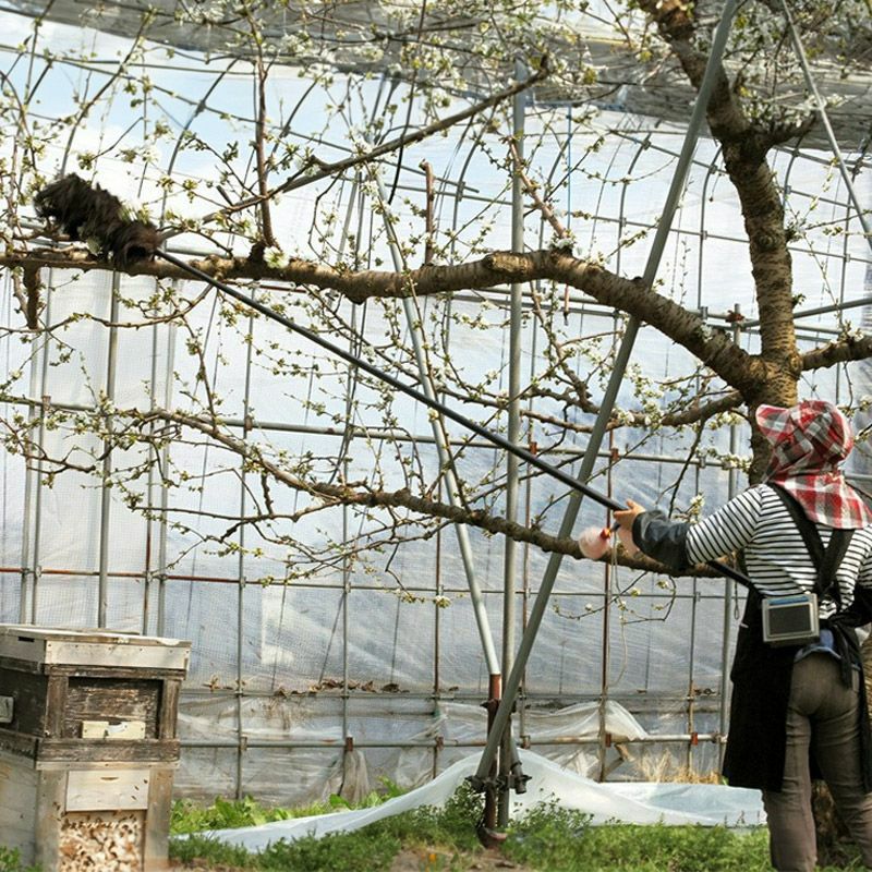 毛バタキを使った受粉 色づきを見て収穫するすぐりもぎの技術