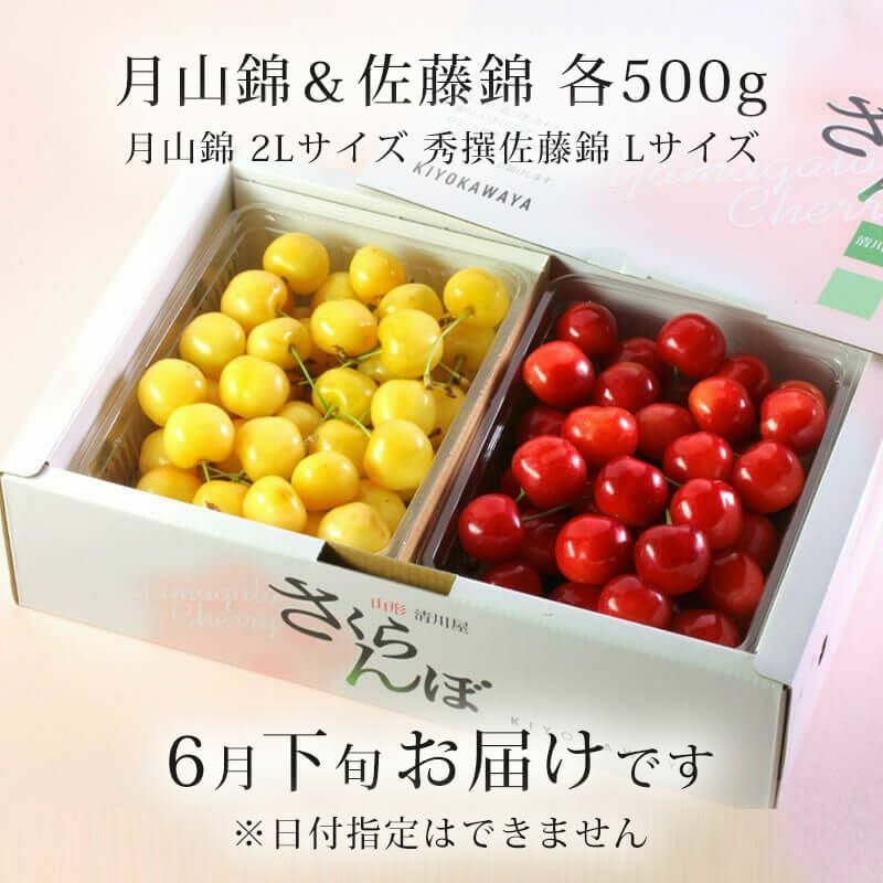 「月山錦(がっさんにしき)」は、鮮やかな黄色が特徴のさくらんぼ。完熟すると果肉に透明感が出て、少し薄茶色がかった色に変化します。食べ応えのある大粒サイズで酸味はほとんどなく、最後にさっぱりとした甘さが広がります。