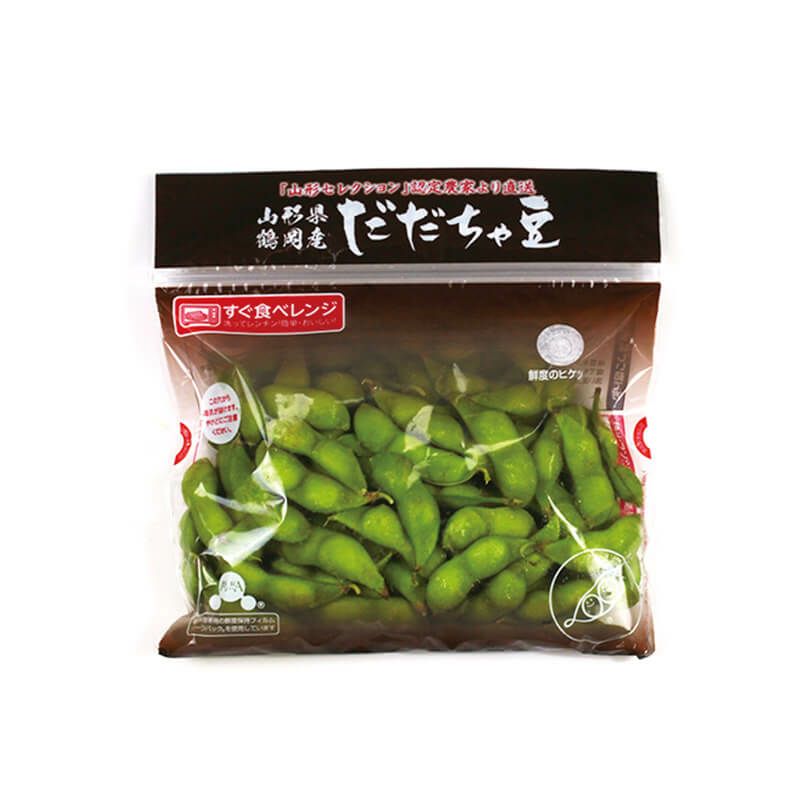 だだちゃ豆を電子レンジ対応の専用袋に入れてお届けします。鍋もボウルも必要なし!袋のままレンジで4分チンするだけ!(1袋500Wの場合)