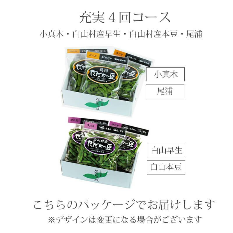 7月下旬お届けの「小真木だだちゃ豆」、8月上旬の収穫で爽やかな風味の「早生豆」、8月下旬最盛期の味わい「本豆」、実入りが良くて甘みが強い9月上旬の晩生品種「尾浦だだちゃ豆」をそれぞれ期間を開けてお届け、早生豆と本豆は、毎年一番人気を誇る発祥の地のブランド枝豆「白山村産だだちゃ豆」をお届けいたします。