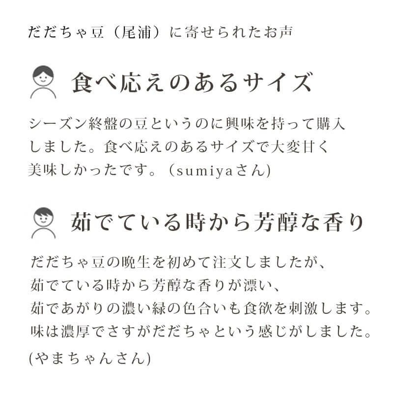 晩生品種の「尾浦だだちゃ豆」は、本豆より緑が濃く、さやは大ぶりかつふっくら。香りはやや弱めですが、なんといっても早生・本豆を凌ぐほどの甘さが特徴!独特のコクと相まって、だだちゃ豆ファンを唸らせる味わいです。