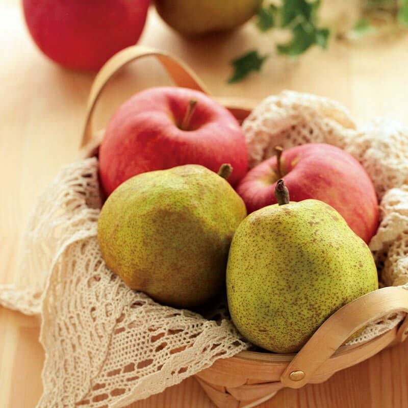 赤く色づいた完熟りんごと、黄緑色のラ・フランスは、見た目のコントラストも美しくギフトに最適。