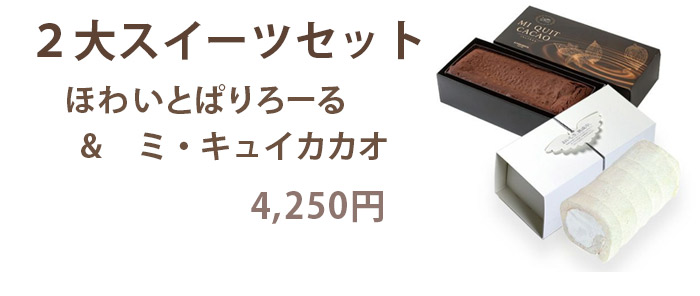 シリーズ累計50万本以上の大ヒットロールケーキ「ほわいとぱりろーる」とチョコ好きには絶対に食べてほしい!濃厚チョコレートケーキ「ミ・キュイカカオ」が一緒に味わえる特別なセットです。