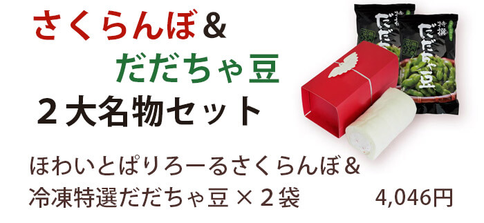 愛されて50万本突破のロングセラー「ほわいとぱりろーる」に山形県産さくらんぼを贅沢に加えた人気バリエーション「ほわいとぱりろーる さくらんぼ」と、山形県鶴岡市発祥の「だだちゃ豆」の茹でたてをマイナス45度で急速冷凍することで、旨味を封じ込めた、年間を通して人気の「冷凍特選だだちゃ豆」の2品をセットにしました。