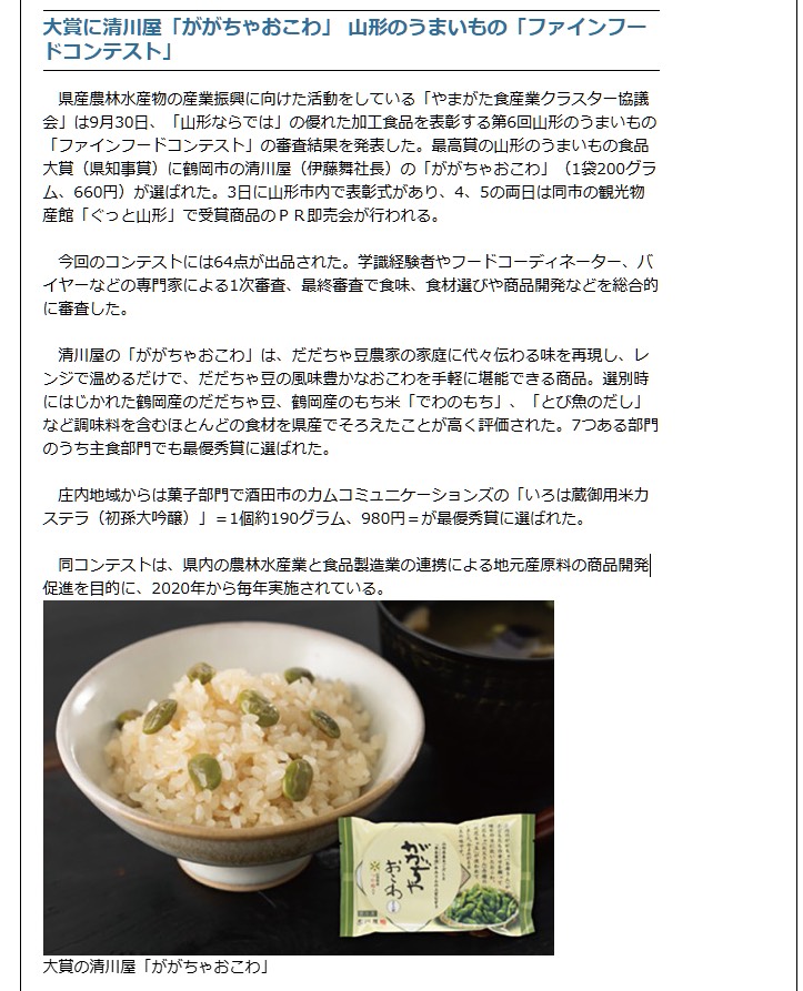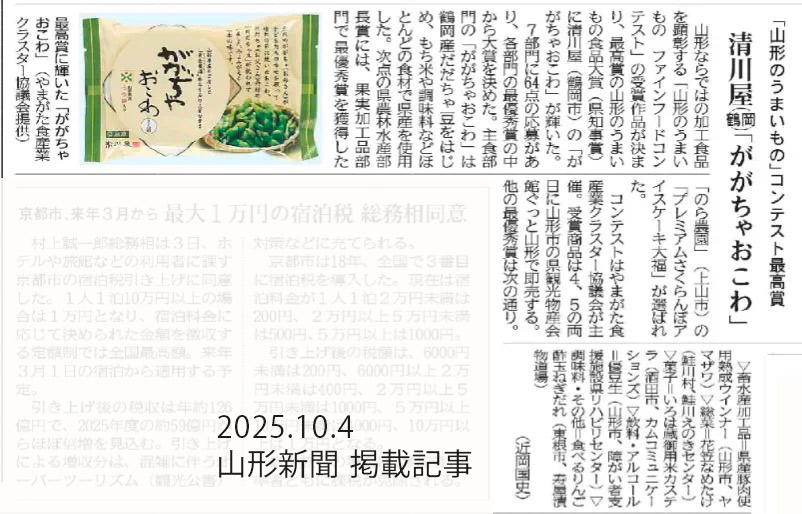 地元・庄内の味をぎゅっと詰め込んだ「ががちゃおこわ」が、山形県を代表する食品コンテストで評価されたこと、本当にうれしく思います。応援してくださる皆さまに、心から感謝申し上げます。