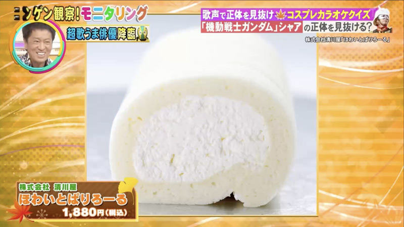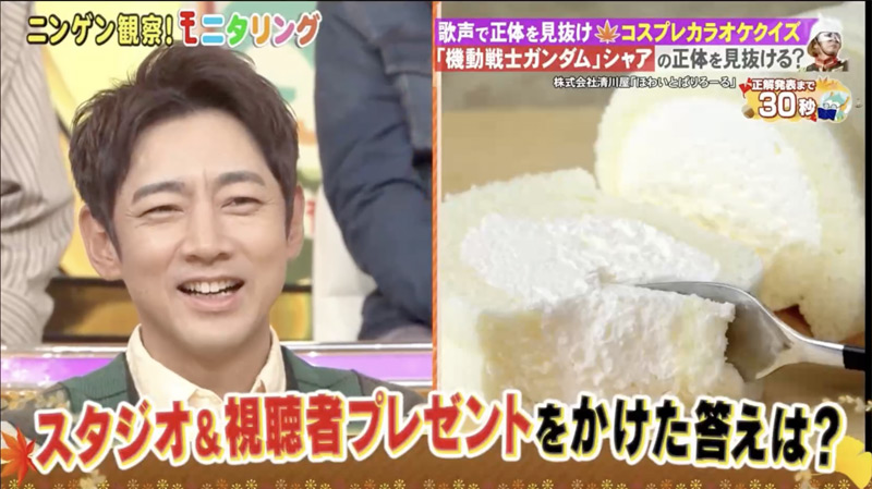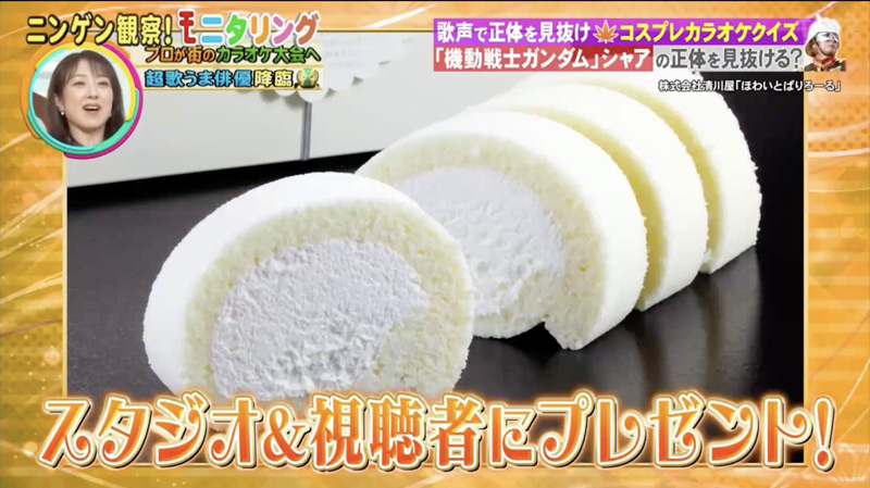 2025年11月27日(木)放送のTBSテレビ系列『ニンゲン観察バラエティ モニタリング』の人気企画「正体を見抜け!コスプレカラオケクイズ」のクイズ正解時の賞品として「ほわいとぱりろーる」が登場しました!
