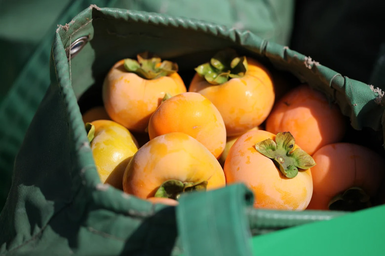 鶴岡市松ヶ岡地区で収穫される庄内柿。 夕陽色の果実をひとくち頬張れば、上品な甘さが広がります。