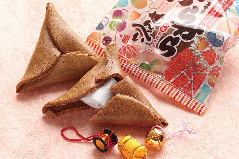 「からから煎餅」は、山形県庄内地方に昔からある伝統菓子です。 三角形に織り込まれた黒砂糖風味のお煎餅を割ると…中から和紙に包まれた、小さな可愛らしいおもちゃが出てくるのです! どんなおもちゃが出てくるかは食べてのお楽しみ♪