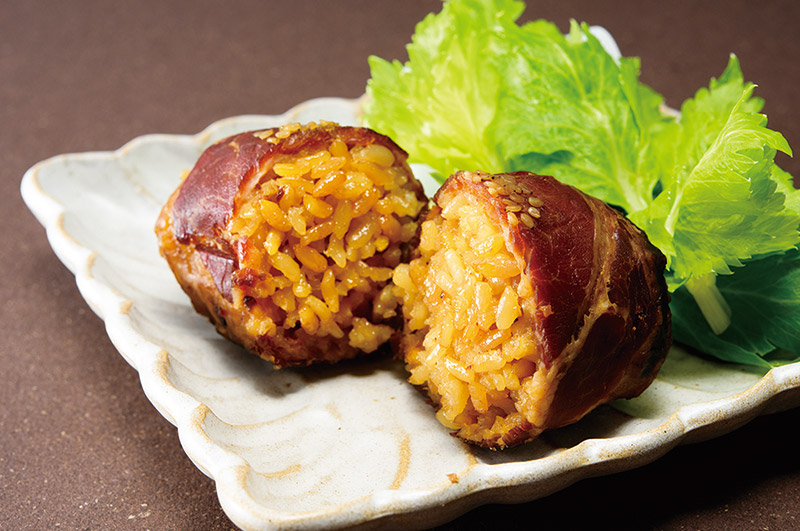 銘柄豚「平田牧場金華豚」で、山形が誇るブランド米「つや姫」をひとつひとつ手巻きで包み、焼き上げた特製肉巻きおにぎりです。