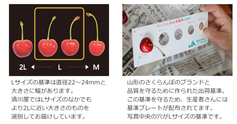 清川屋のさくらんぼの標準サイズの目安は以下の通りです。