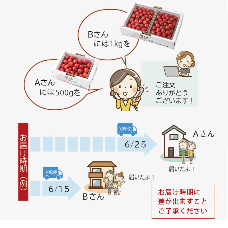 そのため、異なる商品をご注文頂いた場合や、複数箱ご注文頂いた場合、同じ注文日でもお届け時期に差が出る場合がございます。
