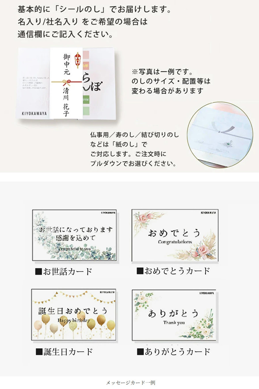 ご希望の場合は、カート内「ラッピング・のし」項目のプルダウンより、ご希望ののしや、メッセージカードをお選びください。