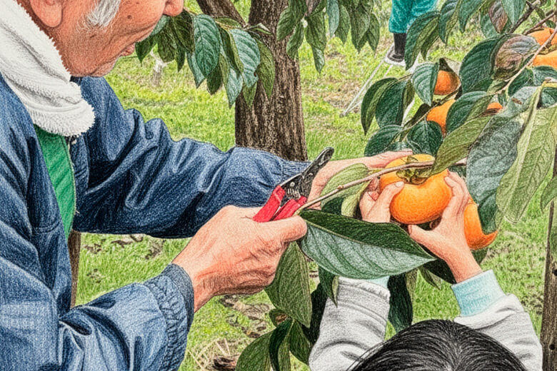 まずは庄内柿の収穫から。実が歪んでいたり傷が付いているものは柿酢用へ。