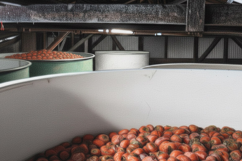 巨大なステンレスタンクに柿を詰め込み、木製発酵蔵で2年間、発酵・熟成させます。