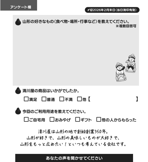 今回の集計は31通。清川屋店舗のある山形県と宮城県の方が10名ずつ。あとは東京都3名、神奈川県2名、岩手県、秋田県、福島県、愛知県、京都府、福井県の方が各1名でした!! 山形の店舗で販売をした商品が、お客様からお客様へと渡り、こうして、全国各地で清川屋の味を知っていただいている・・このことを、こうしてハガキで直接知ることができて、とても嬉しいです!